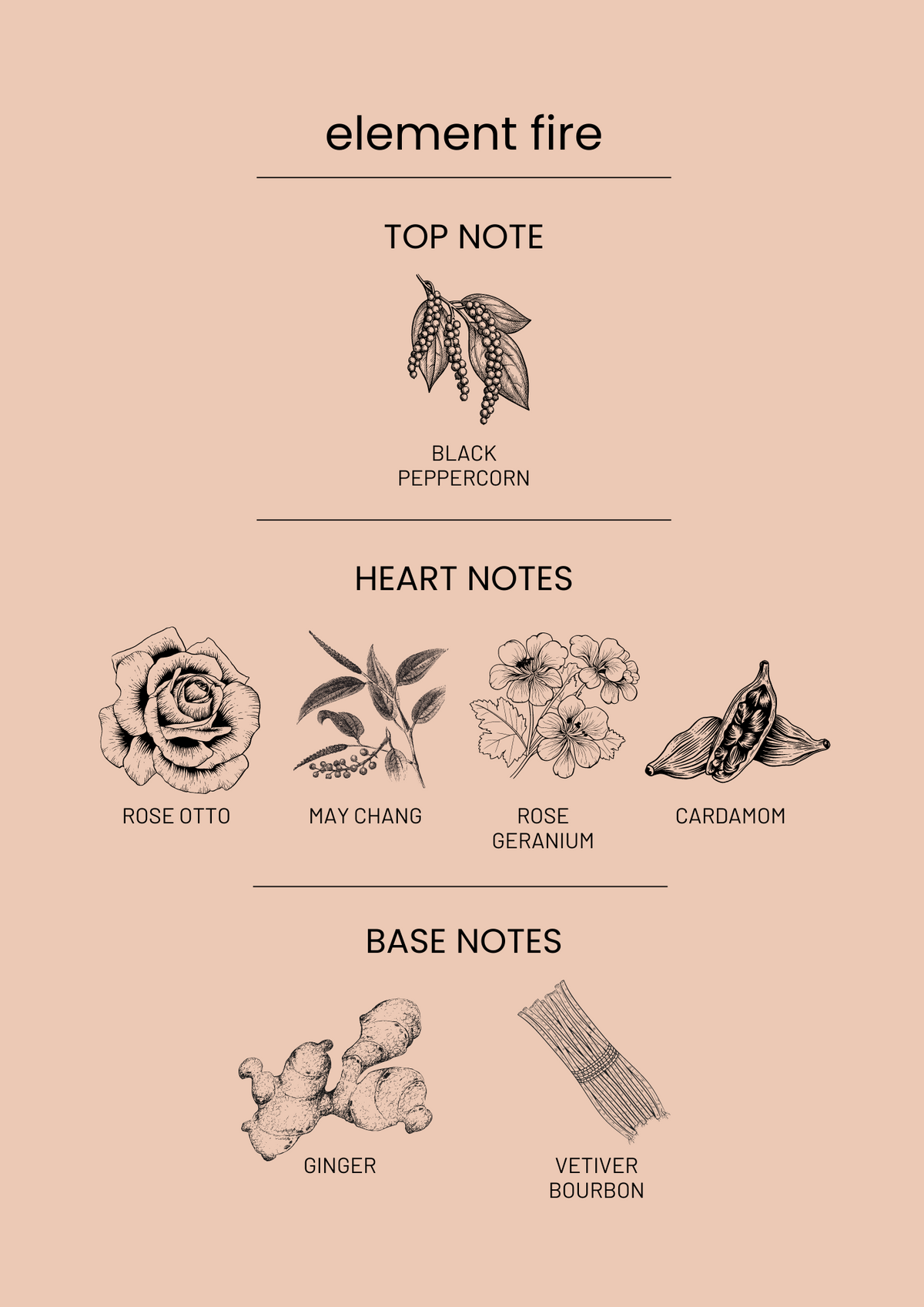 A warm functional fragrance, with the spicy note of Black Pepper, fresh florals of Rose Otto, May Chang, Rose Geranium, and the zesty undertones of Cardamom, Ginger, and Vetiver Bourbon. This water-based fragrance was designed to enhance confidence and stimulate energetic flow.